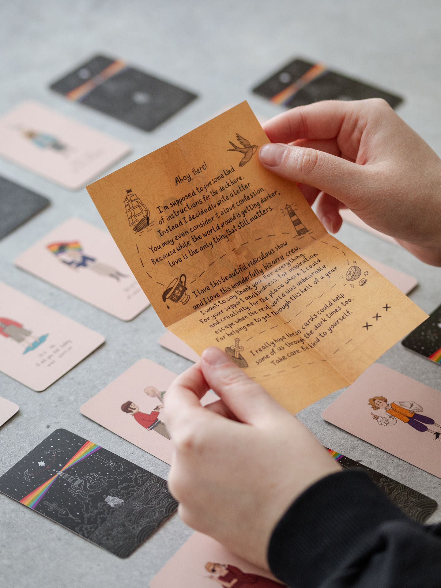 The deck includes 27 character themed cards with supportive messages in a drawer box with a poster with all the crew members inside.